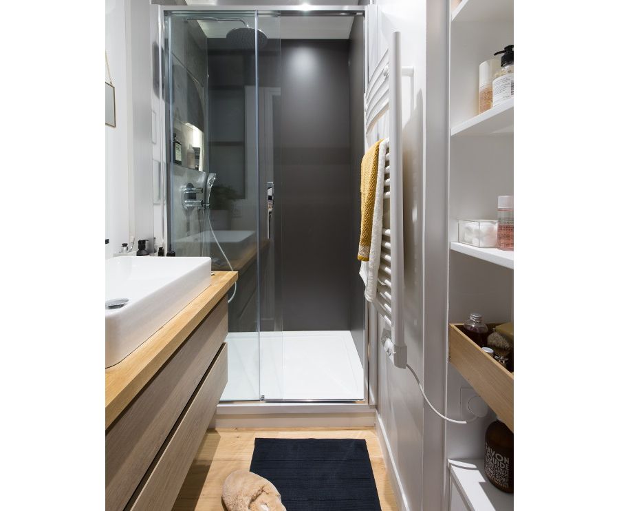 Une Petite Salle De Bain Tout En Longueur Avec Une Grande Douche